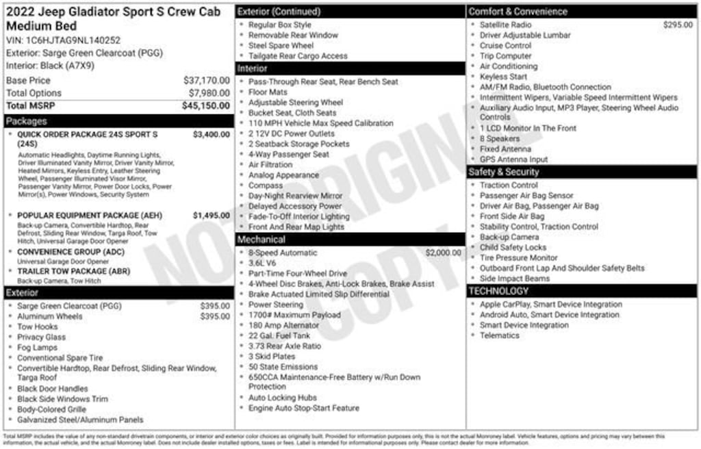 Recent Arrival! 2022 Sarge Green Clearcoat Jeep Gladiator Sport 4WD 3.6L V6 24V VVT This Jeep Gladiator has many features and is well equipped including.Priced below KBB Fair Purchase Price! Clean CARFAX. CARFAX One-Owner.Proudly Serving used car and new car Buick and GMC needs of Sandusky, Norwalk, Cleveland, Toledo, Lorain, Elyria, Amherst, Fremont, Vermilion, Willard and the surrounding areas!!